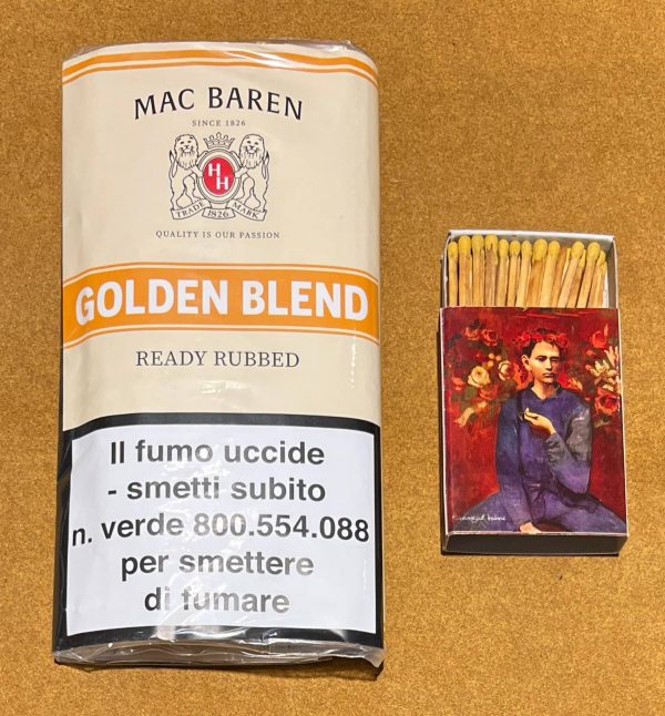 The Golden Blend is a small masterpiece of Mac Baren. Virginia from Brazil and Burley from Malawi were pressed and rubbed up again for the smoker after drying a”ready rubbed”.